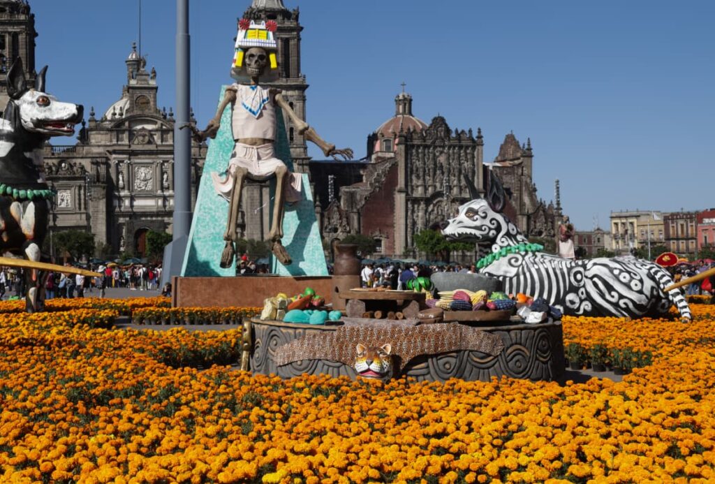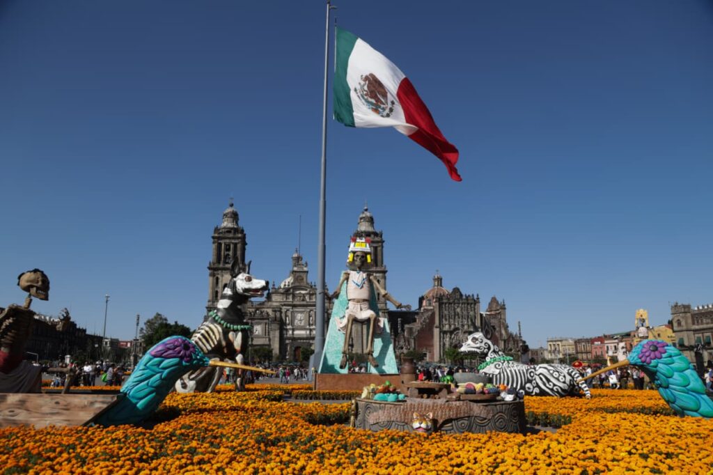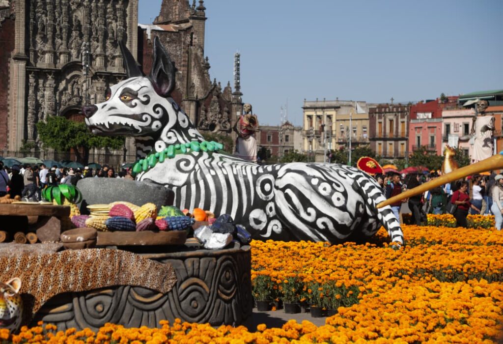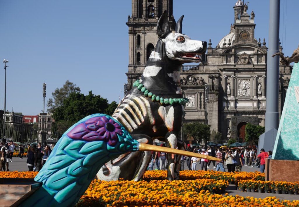 El Zócalo de la Ciudad de México luce una Megaofrenda dedicada al Día de Muertos, con figuras gigantes de xoloitzcuintles, flores de cempasúchil y elementos tradicionales del Mictlán, el inframundo mexica.