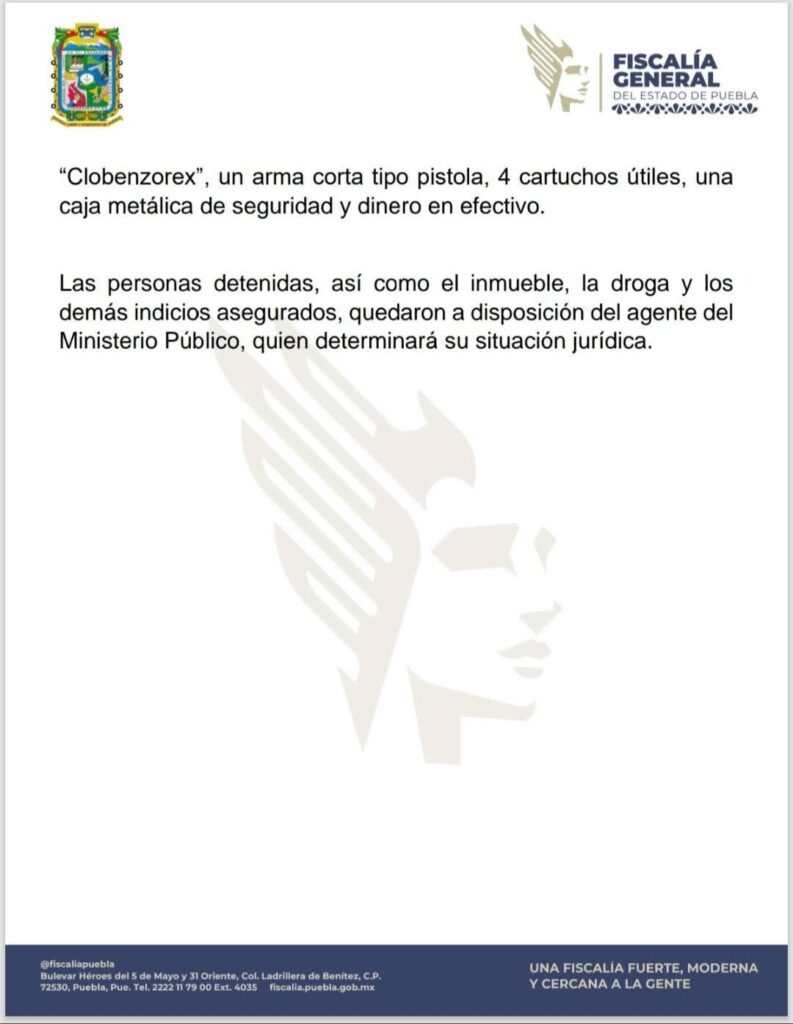 De acuerdo con la FGE, la acción se realizó en coordinación con la Guardia Nacional y la Secretaría de Seguridad Pública Estatal, tras labores de inteligencia y denuncias ciudadanas, que permitieron ubicar un inmueble en la carretera Atlixco–Izúcar de Matamoros, señalado como punto de venta y distribución de droga.
