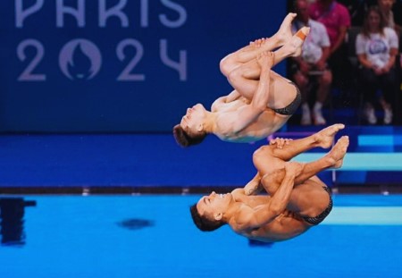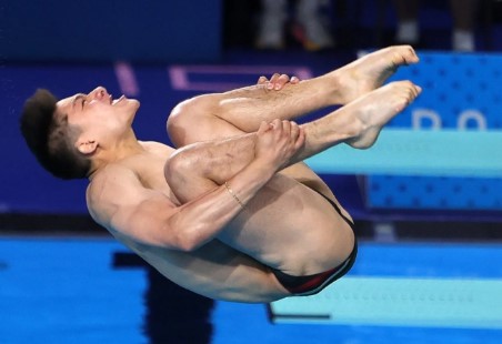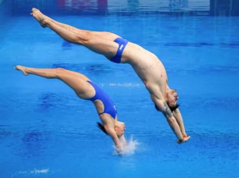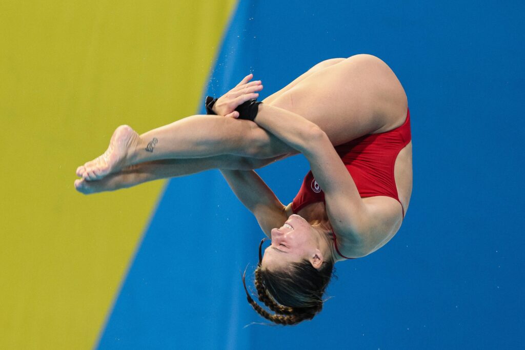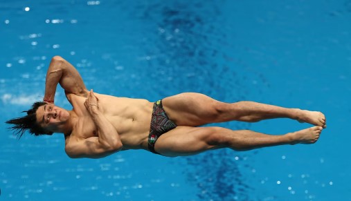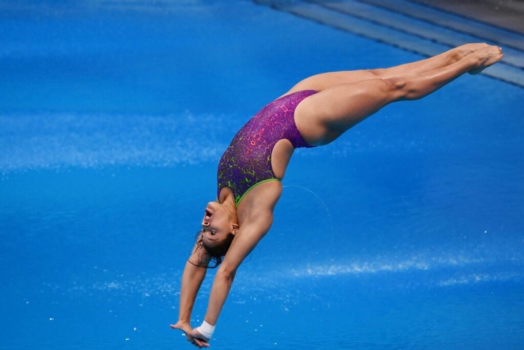 Clavadista profesional ejecutando un salto durante una competencia internacional, disciplina afectada por la cancelación de la Copa Mundial de Clavados en México.