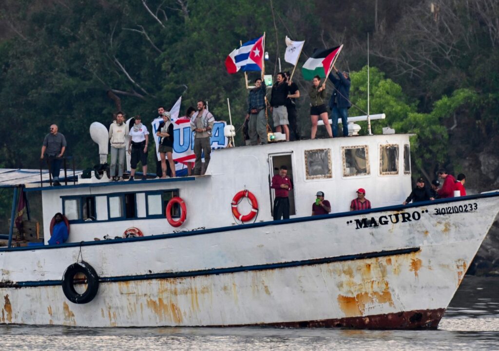 Personas sostienen bandera de Cuba en embarcación durante envío de ayuda humanitaria desde México