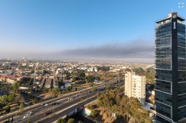 Gran columna de humo negro por incendio en Puebla visible desde periférico ecológico.