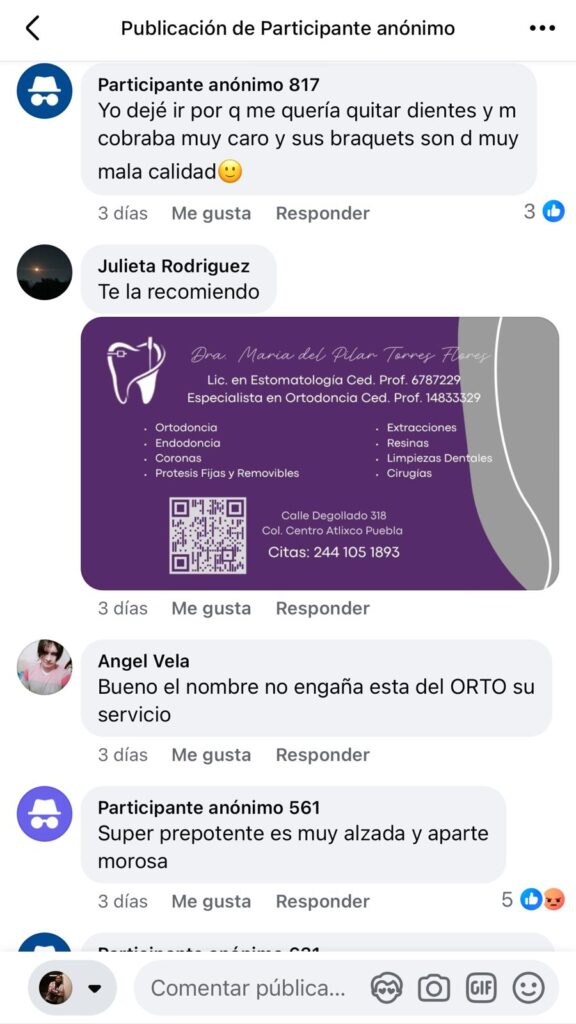 Anuncio de consultorio dental en Atlixco relacionado con denuncias en redes sociales
