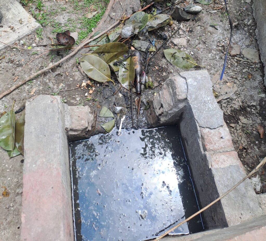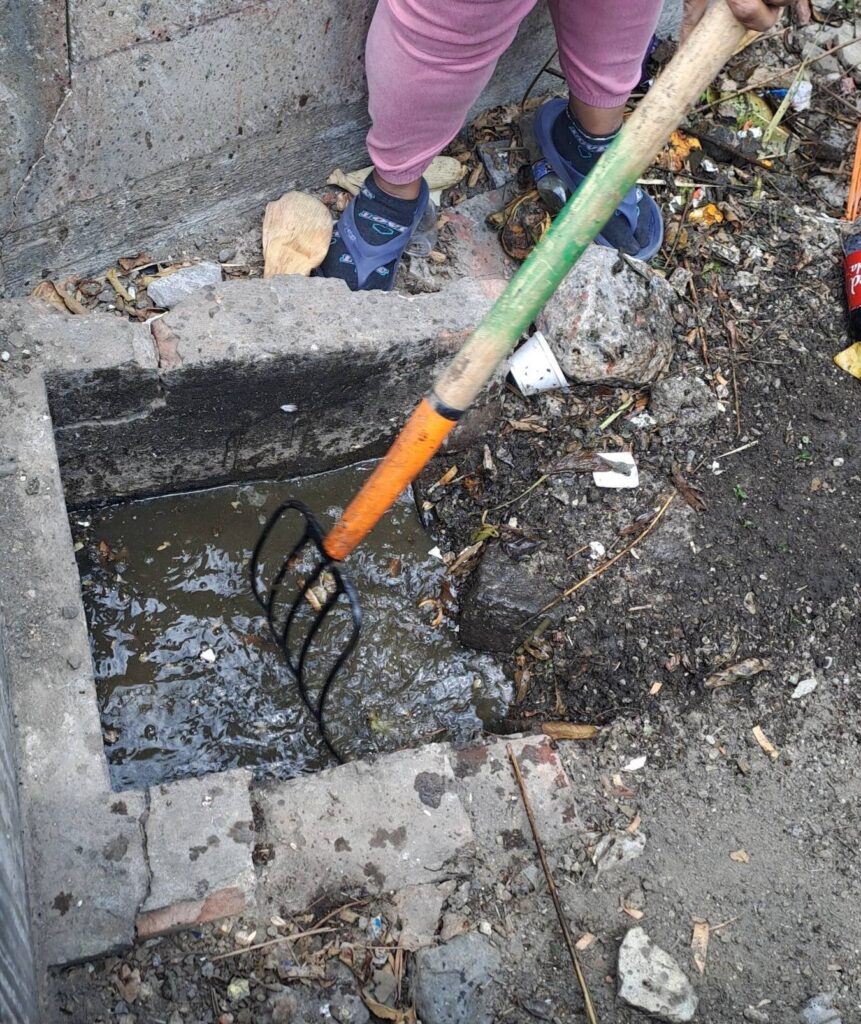 Durante la inspección, se localizó agua estancada en una canaleta de riego, acompañada de residuos orgánicos, grasa y basura, lo que generaba malos olores y representaba un posible riesgo sanitario.